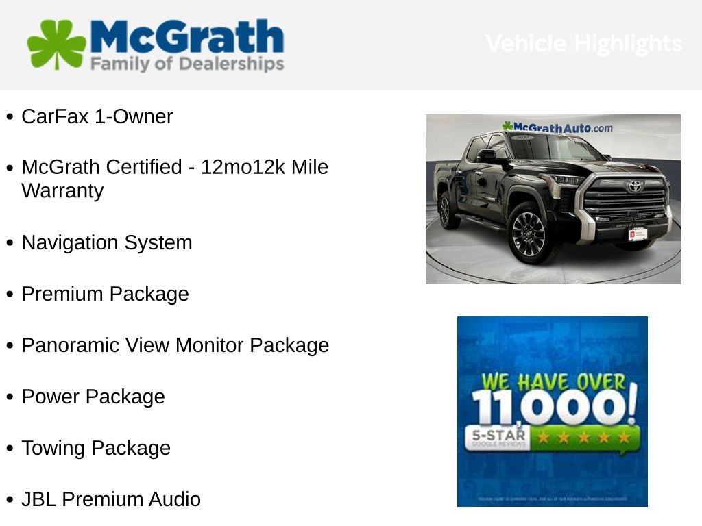 This Tundra has been meticulously maintained and is backed by the McGrath Certified pre-owned program, giving you peace of mind and a 12-month/12,000-mile warranty. With its sleek black exterior and well-appointed interior, this Tundra is sure to turn heads wherever you go.