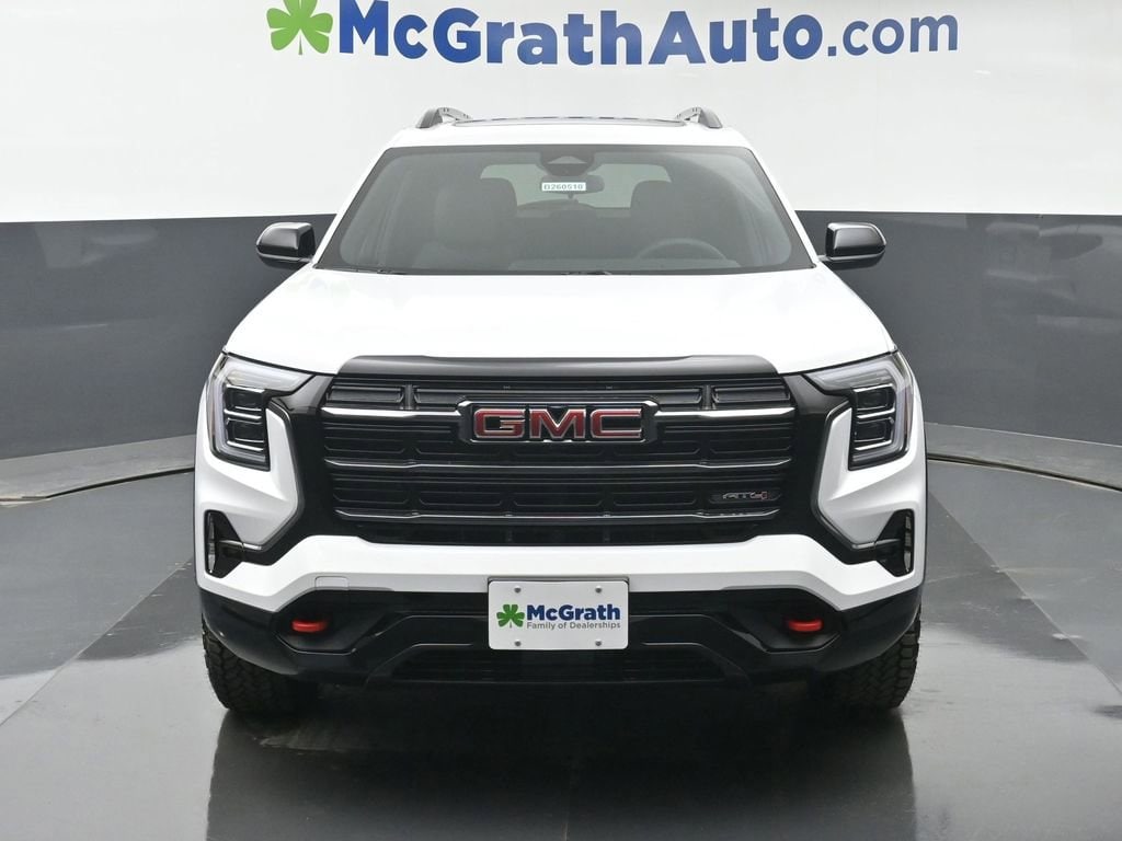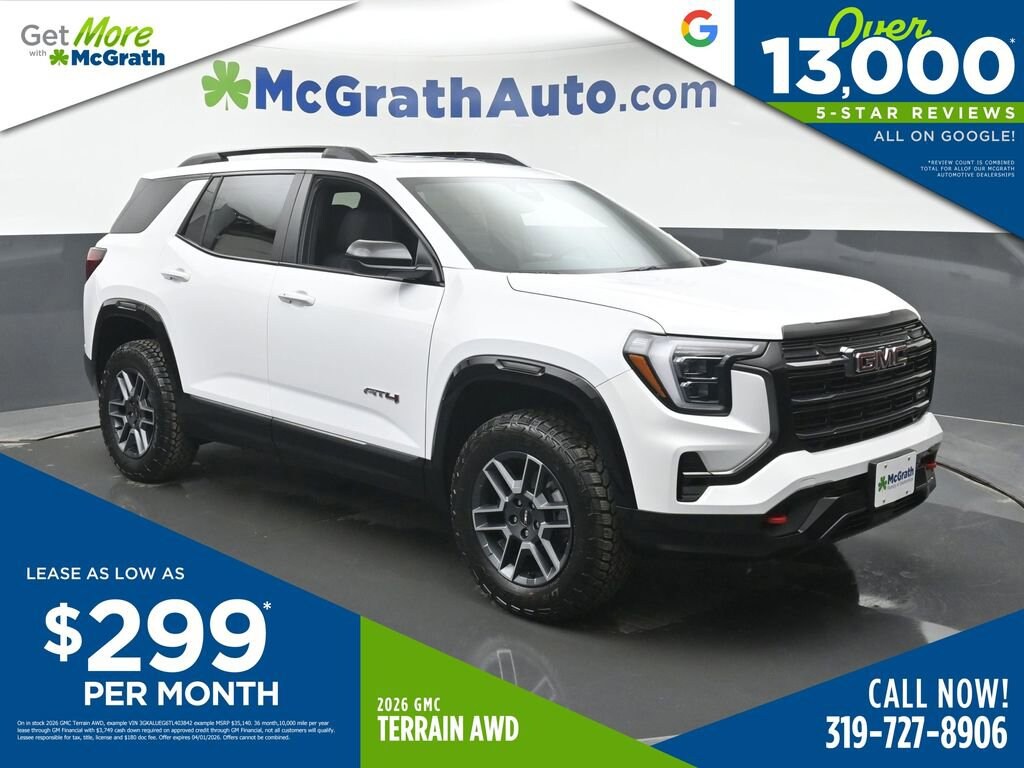 Elevate your driving experience with the exceptional 2026 GMC Terrain AT4. This versatile SUV combines rugged capability, refined style, and a wealth of advanced technologies to elevate your everyday journeys.- Panoramic Power Sunroof with Sunshade- Power Liftgate- Wireless Apple CarPlay/Wireless Android Auto- Heated Steering Wheel- Ventilated Front Seats- Heated Rear Outboard SeatsBeneath the sculpted exterior lies a powerful 1.5L DOHC engine, paired with an 8-Speed Automatic transmission and All-Wheel Drive, delivering a thrilling yet efficient performance. With an EPA-estimated 24 city/26 highway MPG, this Terrain AT4 offers the perfect balance of capability and fuel economy.Step inside the refined cabin and experience the epitome of modern convenience. The Premium GMC Infotainment System, complete with a Navigation System, SiriusXM with 360L Trial Subscription, and a 6-Speaker Audio System, keeps you connected and entertained. Dual-Zone Automatic Climate Control, a Heated Steering Wheel, and Heated and Ventilated Front Seats ensure your comfort in any driving conditions.Safety is paramount in the 2026 Terrain AT4, with features like Forward Collision Alert, Automatic Emergency Braking, Lane Keep Assist with Lane Departure Warning, and a Rear Vision Camera ensuring you and your loved ones arrive at your destination with confidence.Elevate your driving experience and make a statement with the 2026 GMC Terrain AT4. This exceptional SUV is now available at our dealership, and we invite you to schedule a test drive to discover its unparalleled blend of style, technology, and performance. Let us help you find the perfect Terrain AT4 to suit your lifestyle.Prices may change at any time and are subject to availability and prior sale. Taxes, title, license fees, and a $180 documentation fee are not included. Pricing reflects all applicable rebates and incentives assigned to the dealer. Example payments are estimates; actual terms vary based on credit approval. APR and payment estimates apply to qualified buyers, not all buyers qualify for advertised rates. Factory cash incentives may not be combined with promotional APR. Fuel economy ratings and driving range figures are based on EPA estimates for new vehicles, and actual mileage and range may vary. Some in-stock vehicles may include a $1,295 Clear Guard Protection package By submitting your phone number online, you consent to occasional SMS or voice calls about our products and promotions; standard messaging rates may apply. Consult dealer for offer eligibility and other details. Factory MSRP is not the final advertised/asking price of the vehicle. Fuel economy figures are EPA estimates. Price includes: $1000 - Bonus Cash