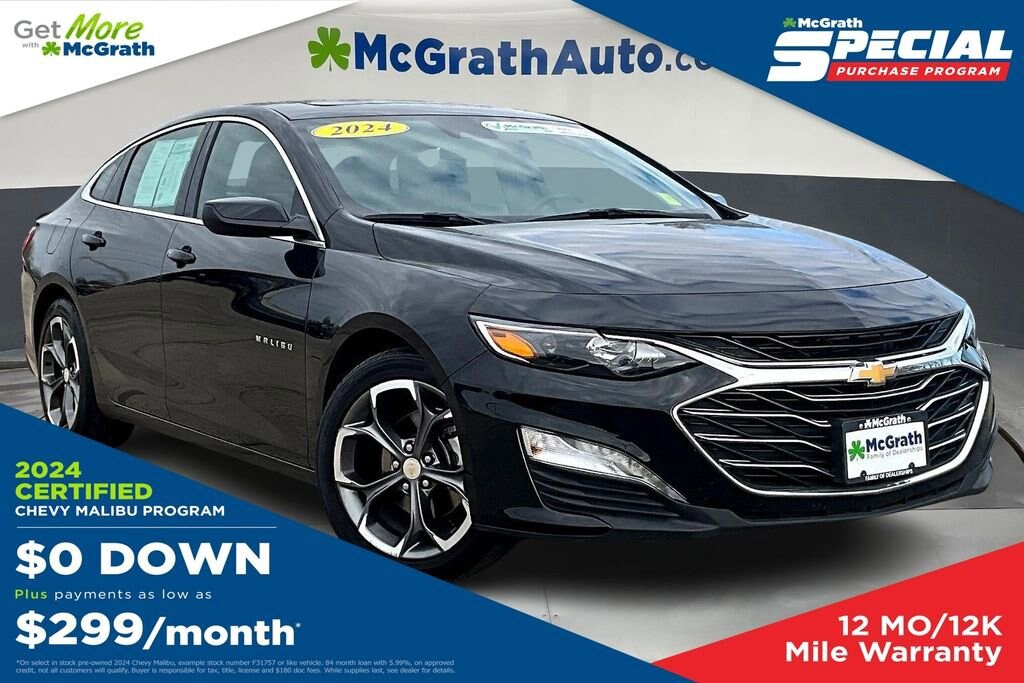 28/36 City/Highway MPG Clean CARFAX.Certification Program Details: McGrath Certified Benefits: * Free Vehicle History Report * 106 Point Full Vehicle Condition Inspection * Like it or Exchange it! Three Day Policy 2024 Chevrolet Malibu LT 1LT 1.5L DOHC FWDWelcome to McGrath Auto, your destination for industry leading automotive experiences. We’re proud to deliver unmatched quality and service. With over 13,000 5-star Google reviews, our customers’ trust and satisfaction drive everything we do. Whether you’re buying, servicing, or building your fleet, experience why McGrath Auto is the top choice for all your automotive needs! We’ve got everything from tough trucks to fuel-sipping commuters and adventure-ready SUVs. Our vehicles go through a rigorous inspection process, and we offer multiple layers of certification based on the vehicle's age, mileage and inspection results. Whether you’re shopping for a brand-new ride or a budget-friendly pre-owned gem, we’re here to make the process easy, fun, and stress-free.Freight fees (not required by law) are included in advertised pricing. Tax, title, license, tags, electronic titling fees, a $180 documentation fee, and any other applicable dealer fees are not included and are the responsibility of the purchaser. Some in-stock vehicles may include a $1,295 Clear Guard Protection package that is pre-installed on select vehicles. MSRP (Manufacturer’s Suggested Retail Price) is provided for informational purposes only and is not the dealer’s advertised or selling price. Advertised pricing complies with manufacturer guidelines and may include all applicable rebates and incentives assigned to the dealer. Additional discounts or savings may be available please contact the dealership to confirm eligibility. All prices, payments, specifications, features, and availability are subject to change without notice and prior sale. Example payments are estimates for illustrative purposes only; actual terms vary based on credit approval, and not all buyers will qualify. Certain factory incentives may not be combined with promotional APR offers. All offers may require financing or leasing through approved lenders. While every reasonable effort is made to ensure accuracy, errors may occur. Please verify all information, including pricing, equipment, and availability, with a dealership representative prior to purchase. Some in-stock vehicles may include a $1,295 Clear Guard Protection package. Fuel economy and driving range figures are EPA estimates; actual mileage and range may vary. The dealer is not responsible for the accuracy of information provided by third-party websites or advertisements not generated by the dealership. By submitting your phone number online, you consent to receive occasional SMS or voice communications regarding products and promotions; standard messaging rates may apply.