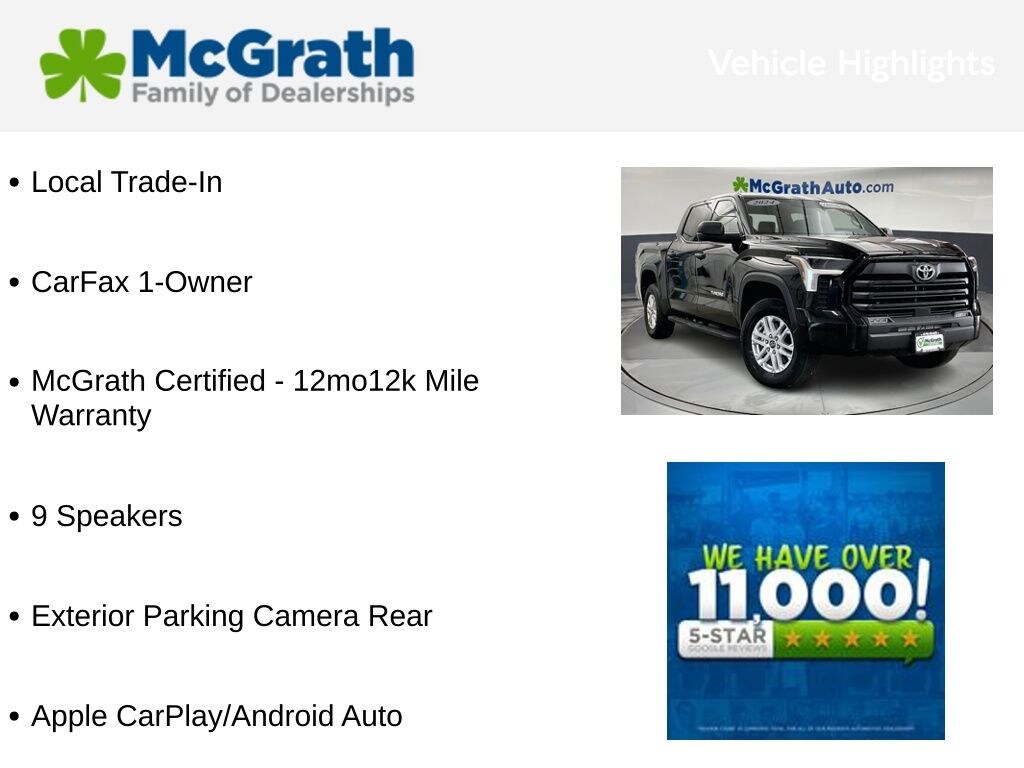 As a McGrath Certified pre-owned vehicle, this Tundra SR5 has undergone a rigorous inspection and comes with a 12-month/12,000-mile warranty, giving you added peace of mind. With its impressive capabilities, premium features, and trusted Toyota heritage, the 2024 Tundra SR5 is the perfect choice for those seeking a versatile and dependable truck.