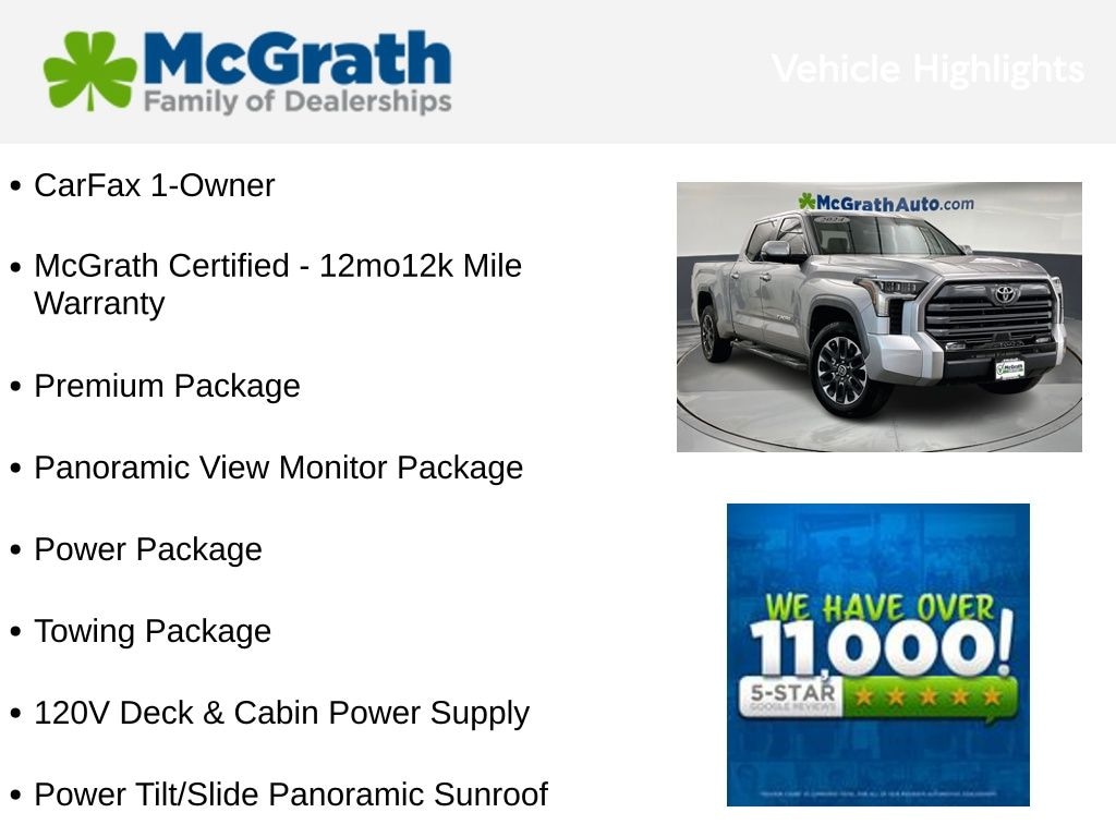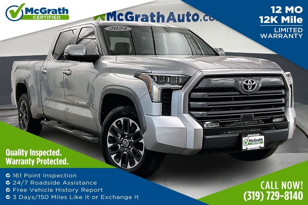 Certified as a McGrath Certified pre-owned vehicle, this 2024 Tundra Limited comes with a 12-month/12,000-mile warranty, giving you the peace of mind you deserve. With its exceptional build quality, advanced safety features, and uncompromising attention to detail, this Tundra is the ultimate choice for discerning truck enthusiasts.